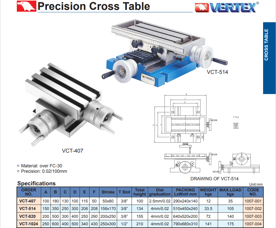 BÀN MÁY PHAY CHỮ THẬP VCT của VERTEX được gắn lên các máy gia công cỡ nhỏ để gia công các chi tiết tương tự như một máy phay bình thường . Bàn máy có thể di chuyển theo 2 chiều X Y bằng các tay quay có vạch chia . Độ chính xác 0.02/100 mm . Vật liệu chế tạo FC-30