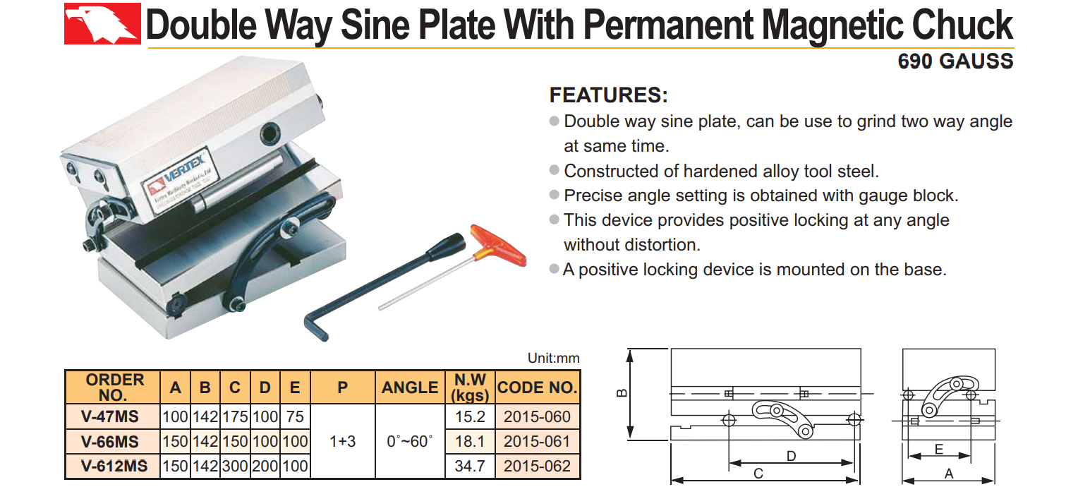 Bàn từ điều chỉnh góc nghiêng Vertex V-47MS dùng để gá các ê tô máy mài trong quá trình mài nghiêng.