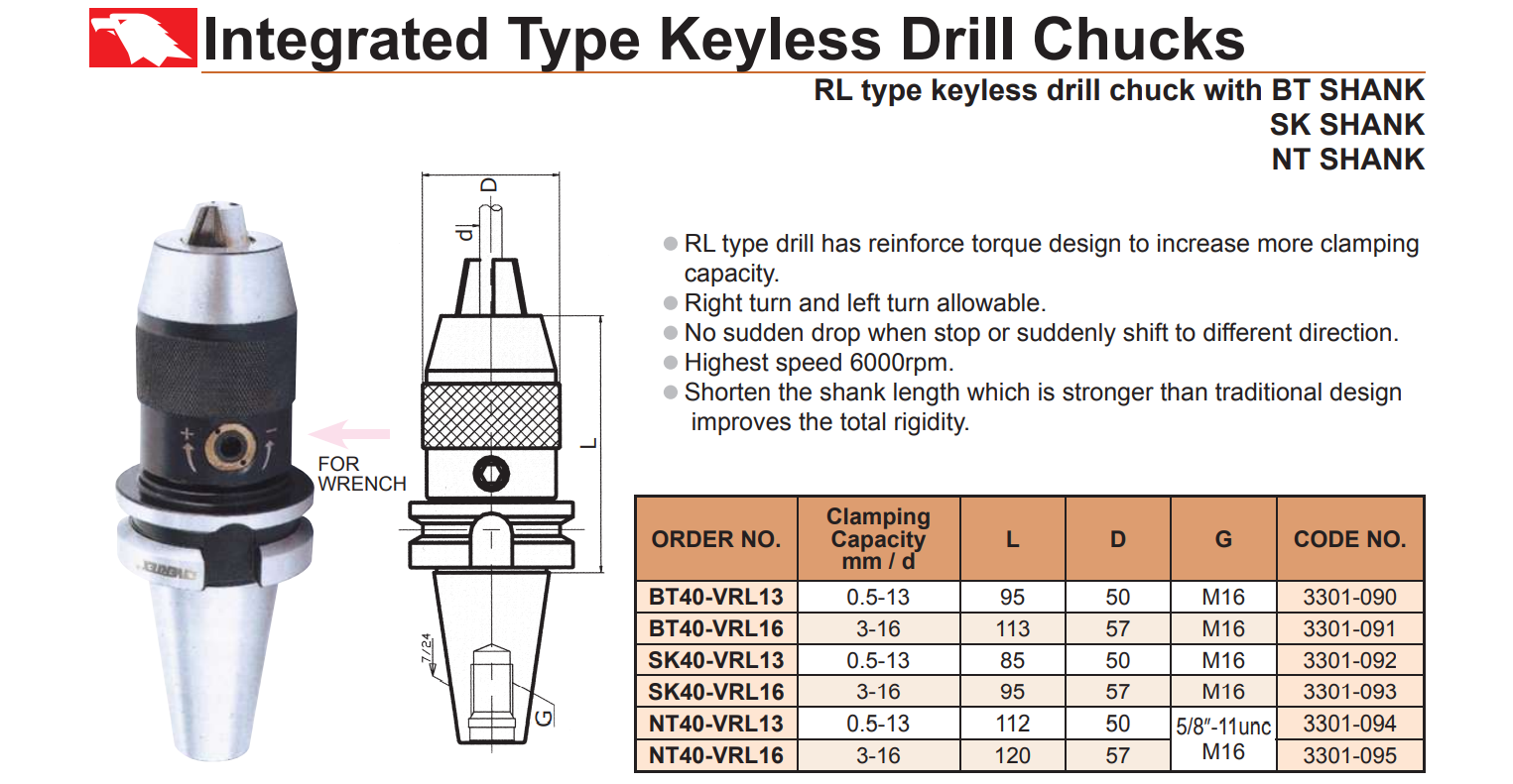 – Bầu kẹp mũi khoan tốc độ cao kiểu RL có thiết kế tăng cường mô men xoắn cho lực kẹp mũi khoan lớn hơn.