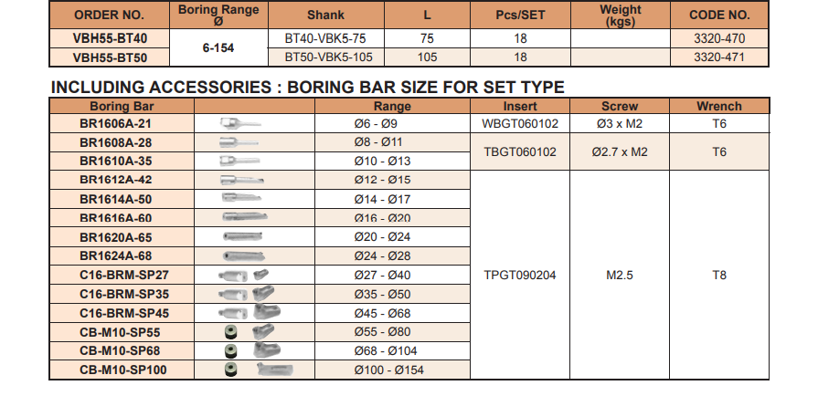 – Bộ đầu doa micro VBH của VERTEX: VBH55-BT40, VBH55-BT50 sử dụng thích hợp doa chính xác các lỗ có đường kính từ 6 – 154mm.