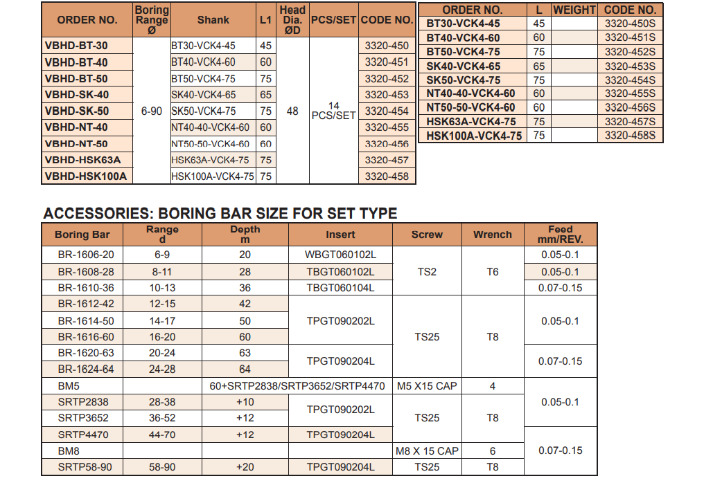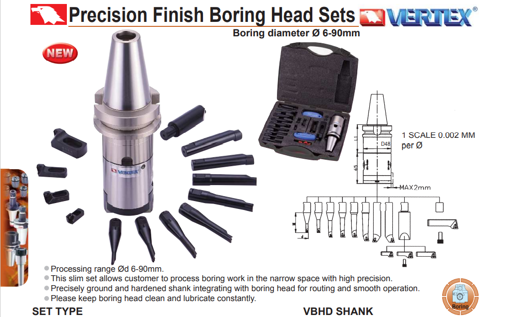 – Bộ đầu doa tinh VBHD của VERTEX: VBHD-BT-30, VBHD-BT-40, VBHD-BT-50, VBHD-SK-40, VBHD-SK-50, VBHD-NT-40, VBHD-NT-50, VBHD-HSK63A, VBHD-HSK100A sử dụng thích hợp doa chính xác các lỗ có đường kính từ 6-90mm.