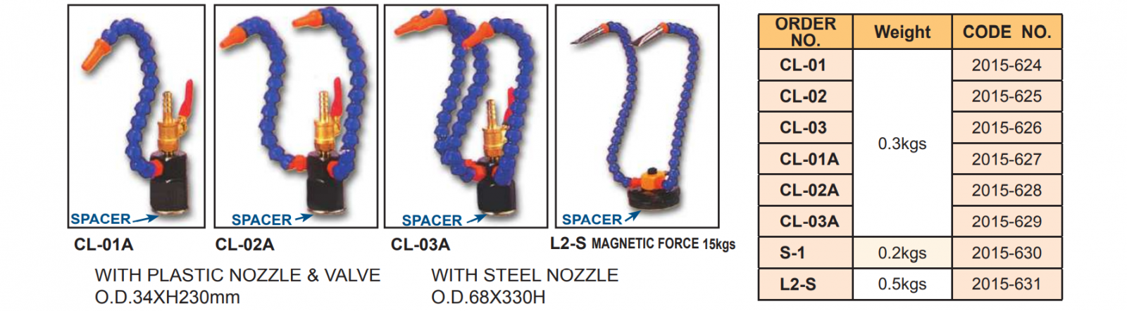 – Bộ vòi tưới nguội bằng nhựa gắn đế từ CL-01, CL-02, CL-03, S-1, CL-01A, CL-02A, CL-03A, L-2 của VERTEX dùng phun dung dịch tưới nguội, dầu làm mát khu vực gia công. Đầu vòi có thể bẻ uốn cong từng khớp theo ý muốn.