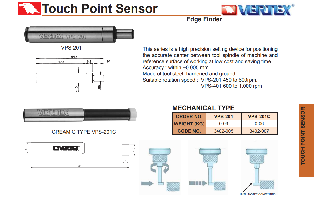 – Dòng cảm biến tiếp xúc VPS-201, VPS-201C cho thiết lập chính xác cao vị trí giữa tâm dụng cụ và bề mặt tham chiếu của phôi với giá thành thấp và thời gian thiết lập nhanh.
