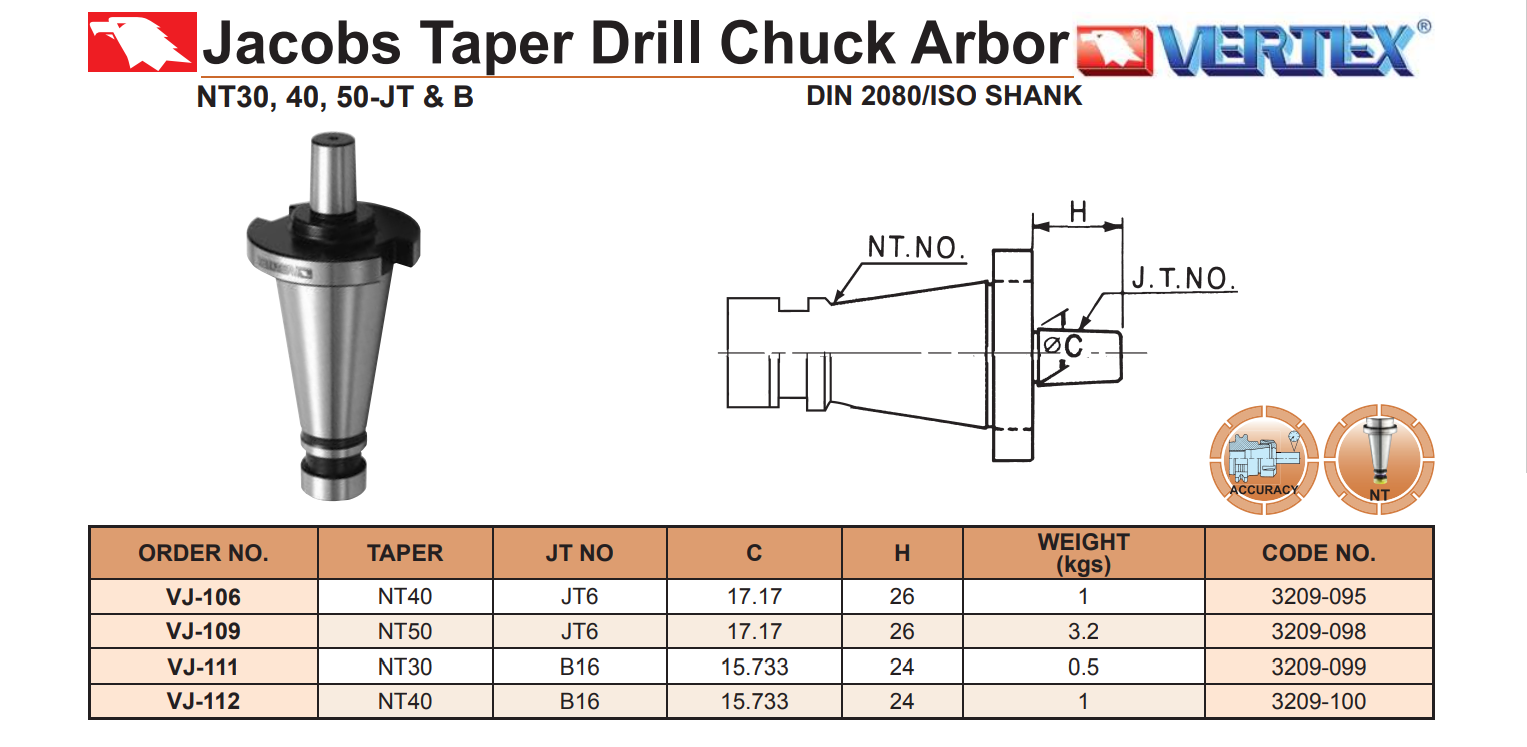 Chuôi bầu kẹp mũi khoan NT30, NT40, NT50 – JT6, B16: VJ-103, VJ-106, VJ-109, VJ-111, VJ-112 của VERTEX lắp với đầu bầu kẹp mũi khoan kiểu JT6, B16 lên máy phay thường có trục chính kiểu côn NT30, NT40, NT50.
