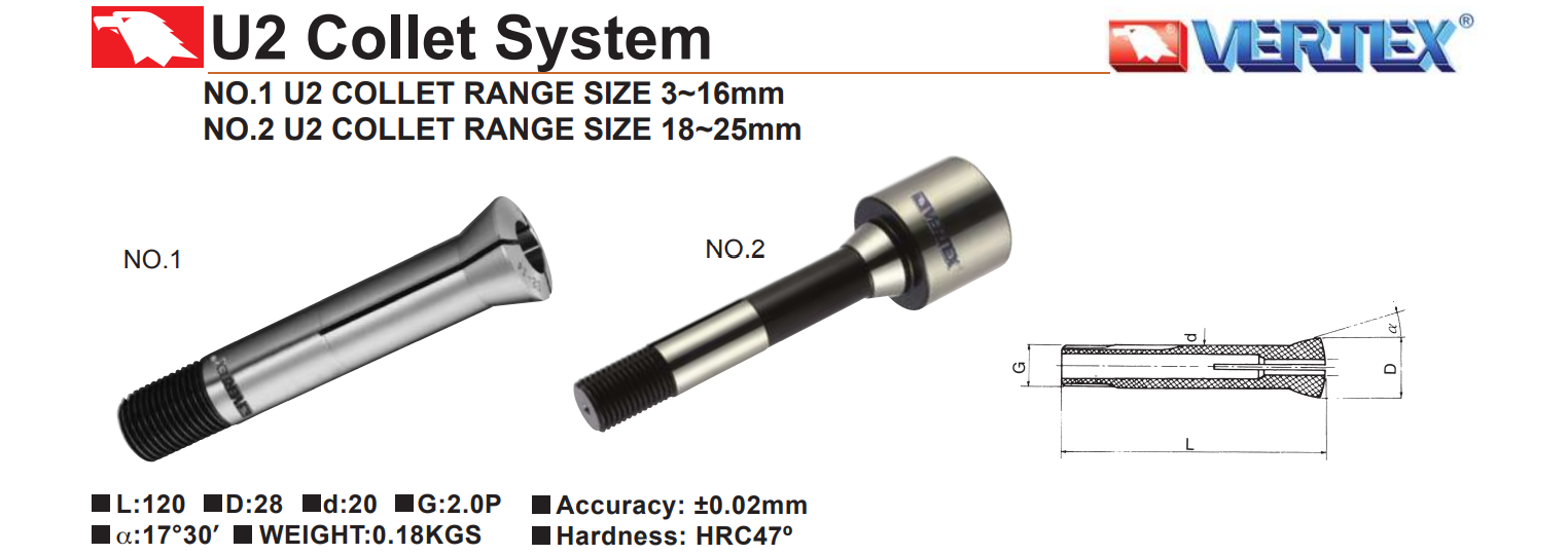 • Collet loại U2 và MT3 hãng Vertex sản xuất có mã gồm VE-U2-1.5, VE-U2-2, VE-U2-3, VE-U2-4, VE-U2-5, VE-U2-6, VE-U2-7, VE-U2-8, VE-U2-9, VE-U2-10, VE-U2-11, VE-U2-12, VE-U2-13, VE-U2-14, VE-U2-15, VE-U2-16, VE-U2-18, VE-U2-20, VE-U2-25, VE-U2-1/8, VE-U2-3/16, VE-U2-1/4, VE-U2-5/16, VE-U2-3/8, VE-U2-1/2, VE-U2-5/8, MT3-4, , MT3-6, MT3-8, MT3-10, MT3-12, MT3-16, MT3-20, MT3-1/8, MT3-1/4, MT3-3/8, MT3-1/2, MT3-5/8, MT3-3/4