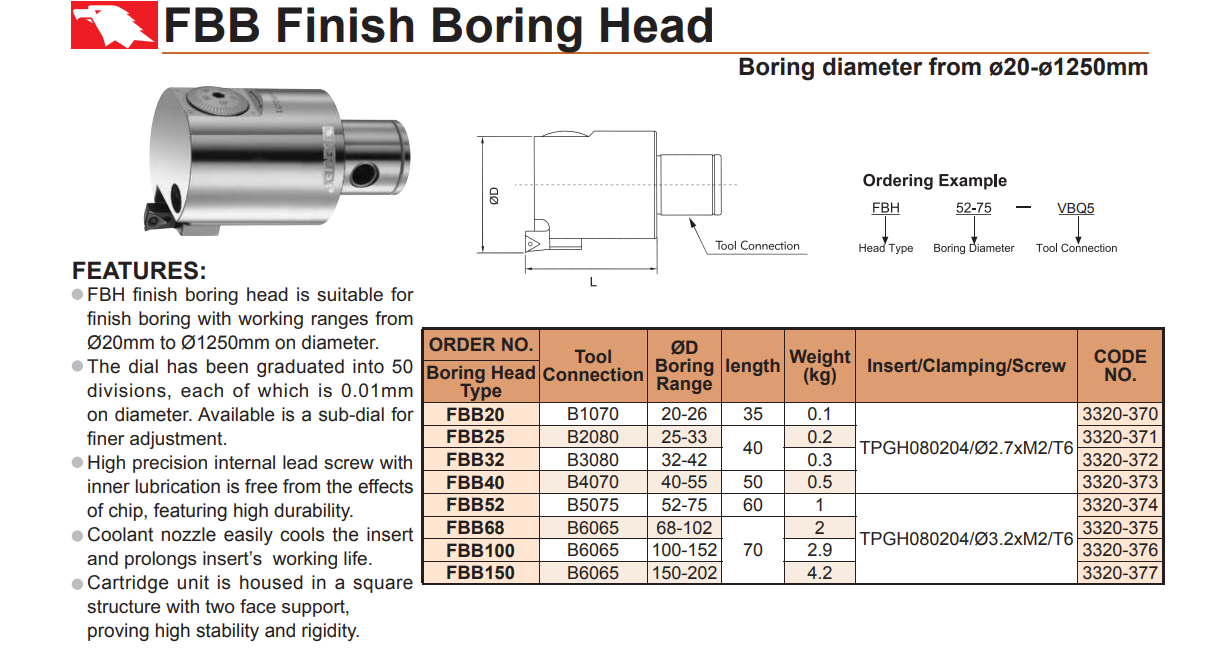 – Đầu dao doa tinh ghép mảnh FBB: FBB20, FBB25, FBB32, FBB40, FBB52, FBB68, FBB100, FBB150 của VERTEX sử dụng doa tinh đường kính lỗ từ D25 ~ D1200mm, trên máy phay CNC BT30, BT40, BT50.