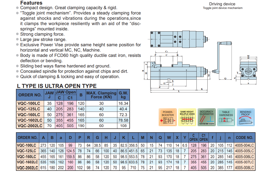– Ê tô thủy lực VQC-LC có khoảng kẹp rộng và chống mài mòn cao.
