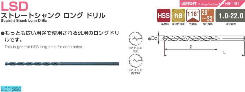 Mũi khoan NACHI LIST 550 là dòng mũi khoan thép gió dài sử dụng cho nhiều vật liệu khác nhau. Thích hợp gia công thép khuôn, thép thường và có thể làm việc được với vật liệu khác nhau. Cần gia công cho các chi tiết khoan sâu