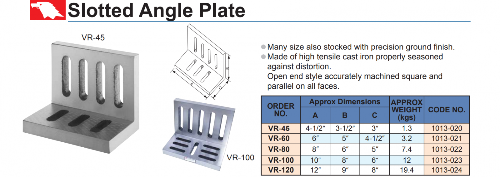 – Tấm góc vuông có rãnh VR-45, VR-60, VR-80, VR-100, VR-120 có kích thước chiều dài lớn, thường dùng định vị cho các chi tiết rộng.