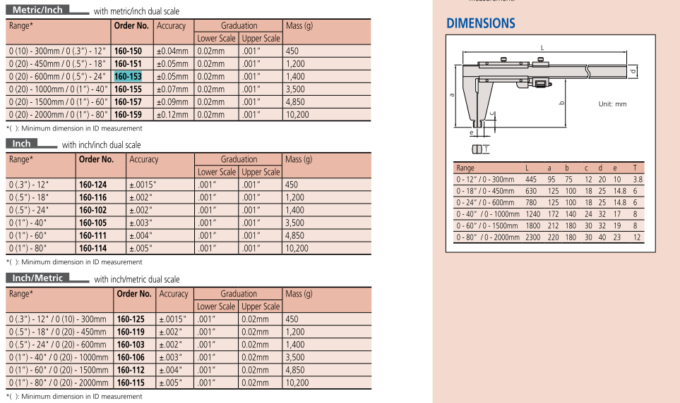 Mã hàng 160-155 là thước cặp cơ khí 0-40''/0-1000mm/0.05mm