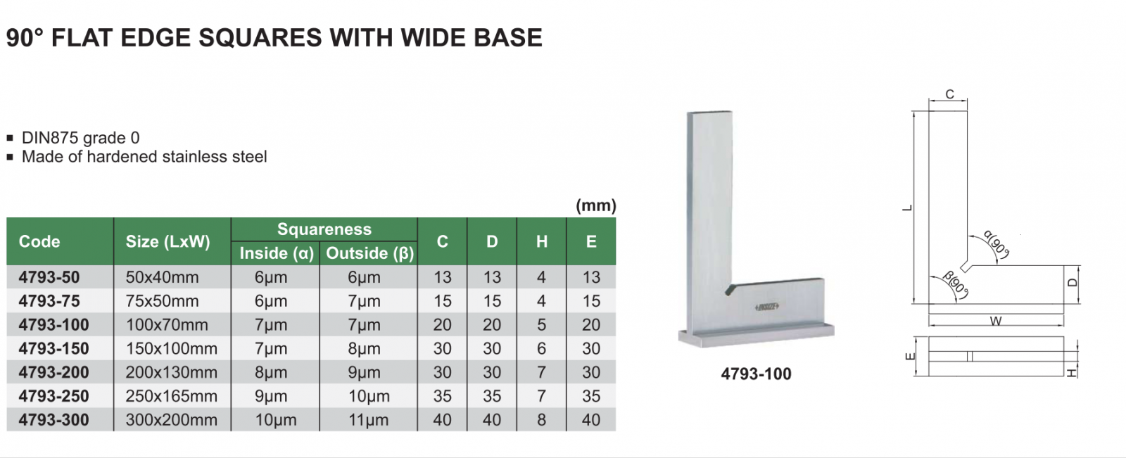 Thước đo góc INSIZE 4793-100 , 90 độ FLAT EDGE SQUARES WITH WIDE BASE 4793-100